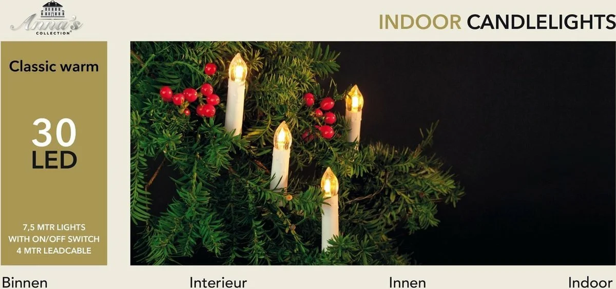 Anna's Collection - Kaarsverlichting met 50 lampjes die 25 cm uit elkaar staan. Doordat het LED lampje van de kaars classic warm van kleur is lijkt het net of het echte kaarsjes zijn. De lengte van het snoer is 12.5 meter en is groen van kleur en heeft een aan/uit schakelaar het aanloopsnoer is 4 meter.