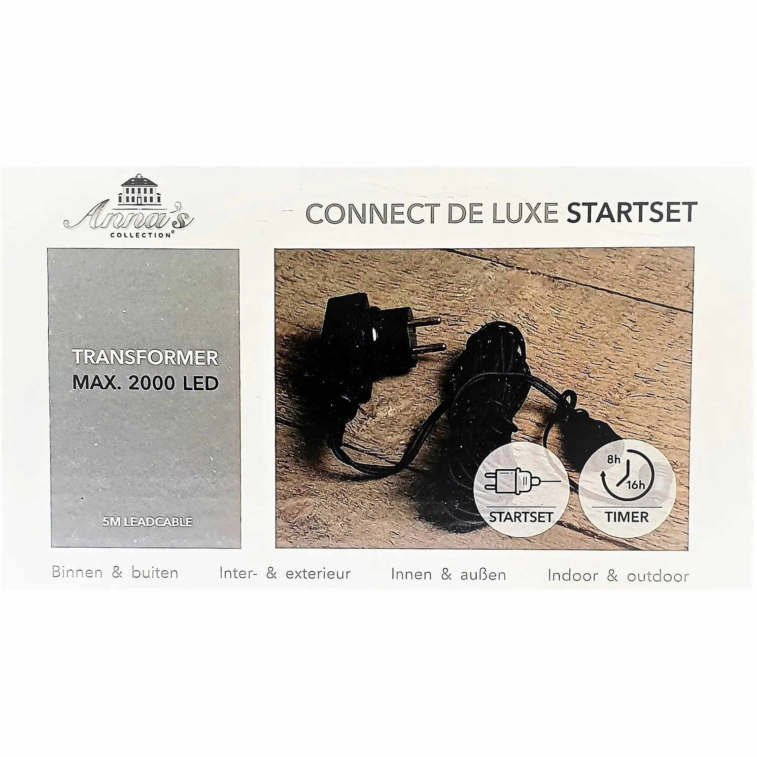 Adaptor voor koppelbare LED-verlichting van Connect Deluxe. Past alleen op de Connect Deluxe snoer. De Connect Deluxe snoeren worden allemaal geleverd zonder adaptor dus deze adaptor is altijd nodig. Geschikt tot 2000 lampjes te koppelen, de lengte van het aanloopsnoer is 5 meter. Het IP44 aansluit snoer heeft een timer van 8 uur aan 16 uur uit.