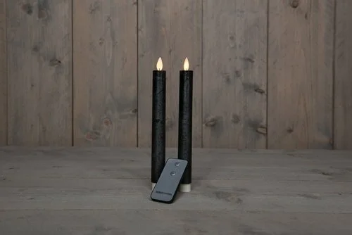 Anna's Collection LED dinerkaarsen antraciet is een set van 2x stuks. De maat van de kaars is H23 x D 2.5cm. Deze 2 kaarsen zijn voorzien van een vlam effect, waardoor het net echte diner kaarsen lijken en kunnen met een afstandsbediening worden aangestuurd (aan en uit) en werkt op een knoopcel batterij (CR2025) deze is inclusief. De LED tafelkaars werkt op 2 AA batterijen ze zijn per twee verpakt u heeft daarom 4 AA baterijen nodig per verpakking. De kaarsen zijn alleen geschikt voor binnenshuis, de batterijen (niet inbegrepen).