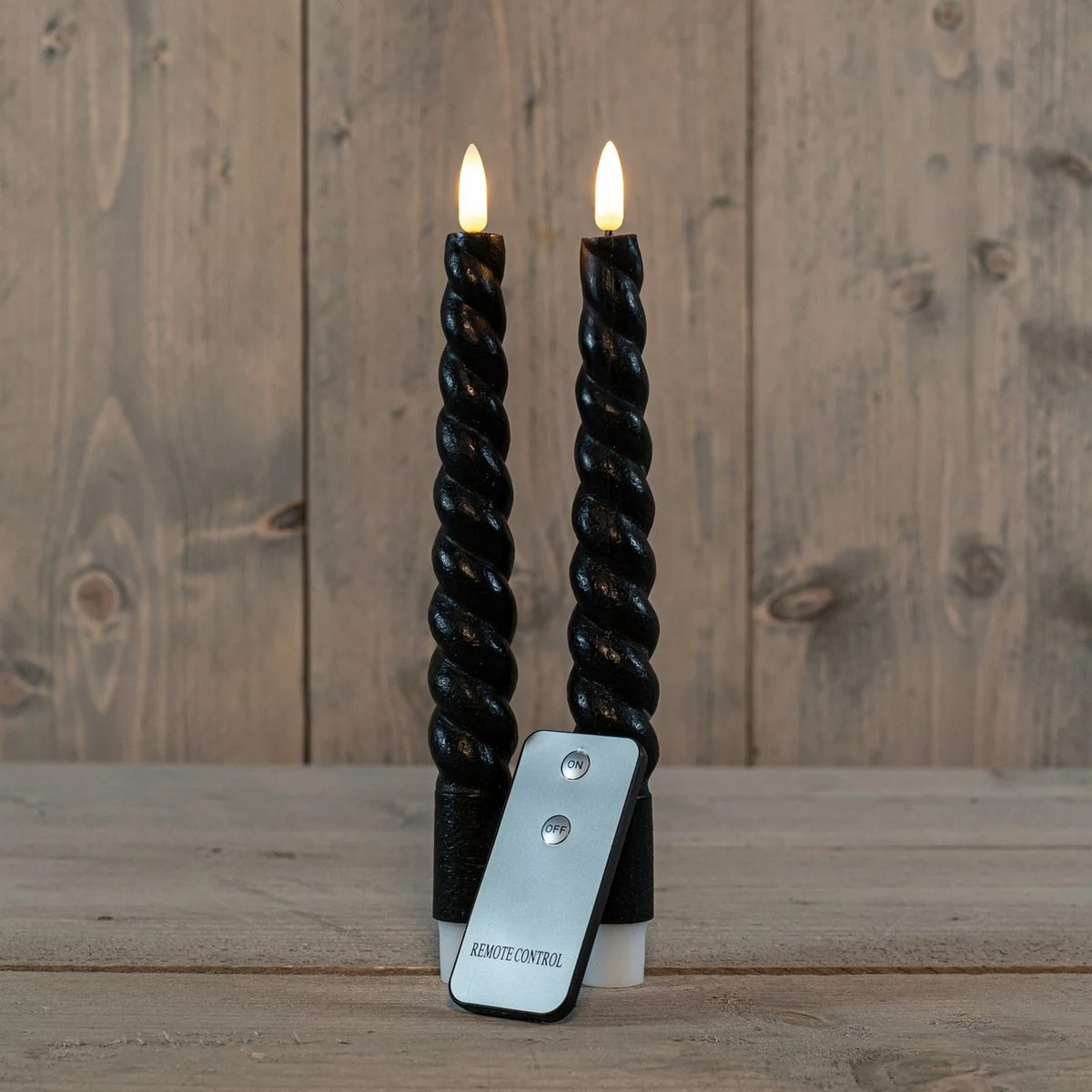 Anna's Collection LED spiraal dinerkaarsen zwart is een set van 2x stuks. De maat van de kaars is H23 x D 2.5cm. Deze 2 kaarsen zijn voorzien van LED verlichting en kunnen met een afstandsbediening worden aangestuurd (aan en uit) en werkt op een knoopcel batterij (CR2025) deze is inclusief. De LED tafelkaars werkt op 2 AAA batterijen ze zijn per twee verpakt u heeft daarom 4 AAA baterijen nodig per verpakking. Deze variant heeft een 3D lont en de vlam beweegt niet. met elkaar kunt combineren. De kaarsen zijn alleen geschikt voor binnenshuis, de batterijen (niet inbegrepen).