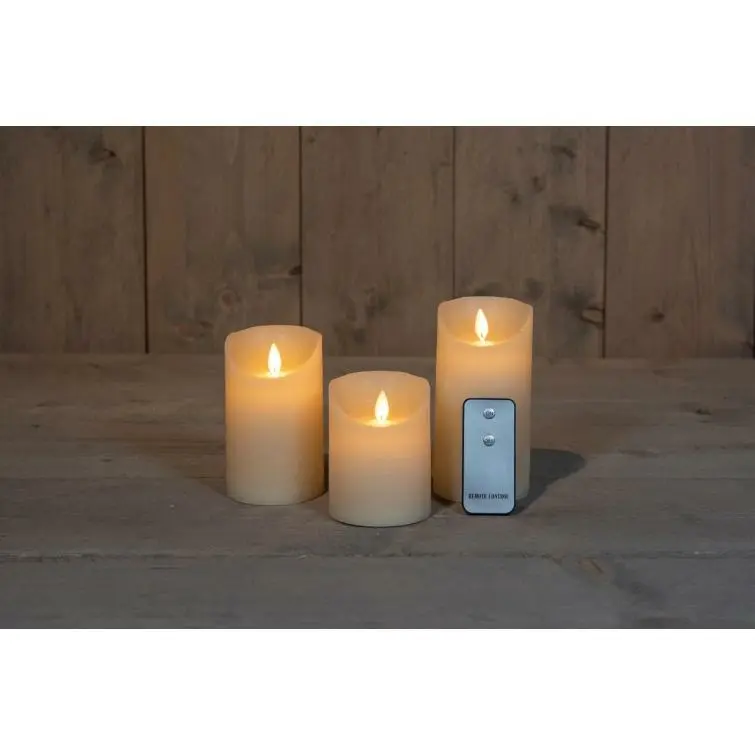 Deze set LED stompkaars met bewegende vlam met de maten H10 cm, 12,5 en 15 cm D7,5 cm. De ANNA"S Collection stompkaars heeft een bewegende vlam verlichting die de illusie geeft van echt kaarslicht. Elke kaars werkt op 3 AAA . Met de bijgeleverde afstand bediening (inclusief batterij CR2025) kan u de kaarsen aan en uit zetten. Deze kaarsen zijn uitsluitend bedoeld voor het gebruik binnenshuis.