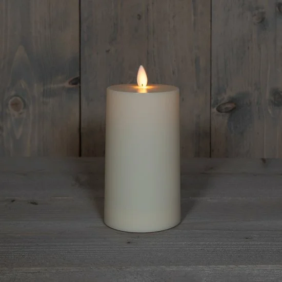 LED kaars/stompkaars die geschikt is voor buiten gebruik. Deze sfeervolle LED kaars in de kleur ivoor wit heeft een bewegende vlam. Het handige aan deze kaars is dat hij speciaal is gemaakt om buiten neer te kunnen zetten of binnen in het zonlicht zonder dat de kaars vervormd. De kaars heeft een warm witte bewegende LED vlam en is inclusief 6/18 uurs timer waardoor ze automatisch uitgaan na een bepaalde tijd. Geniet dus van een gezellige sfeer zonder je zorgen te maken over brandgevaar. Diameter kaarsen: 8 cm. Hoogte grootste kaars: 16 cm. Voeding: 2 C batterijen (niet inbegrepen). 500 branduren. Materiaal: kunststof.