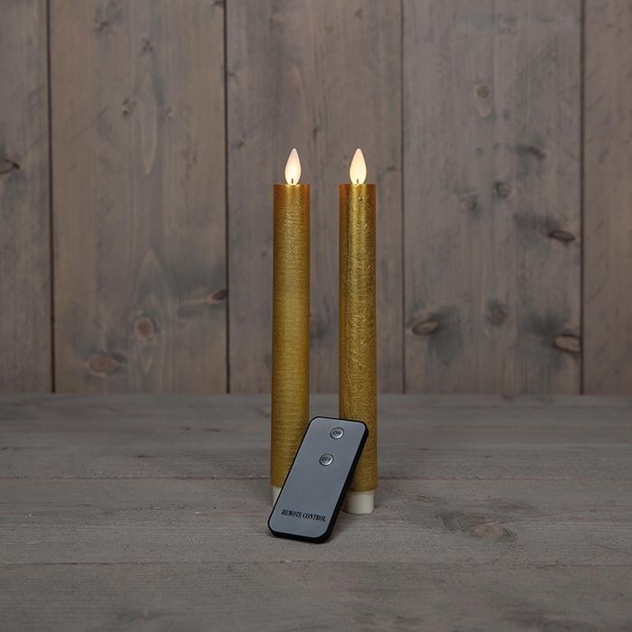 LED dinerkaarsen 2x stuks van 23 cm. Voeg een vleugje luxe toe aan je diner met deze set van 2x stuks dinerkaarsen in de kleur goud. Met een hoogte van 23 cm en LED bewegende vlam, zorg je voor een warme en elegante sfeer. Gemakkelijk te bedienen met de meegeleverde afstandsbediening, inclusief dimmer en timer functie. 2 AA batterijen per kaars worden niet meegeleverd. Laat de betovering van kaarslicht zonder zorgen om open vuur je tafel verfraaien met deze stijlvolle LED dinerkaarsen.