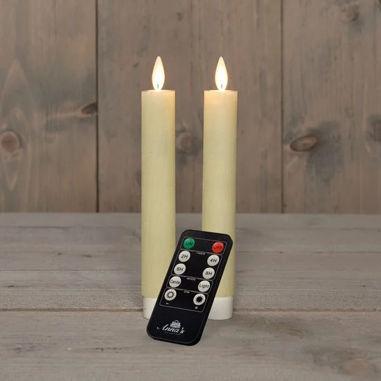 LED dinerkaarsen 2x stuks van 18 cm. Voeg een vleugje luxe toe aan je diner met deze set van 2x stuks dinerkaarsen in de kleur ivoor. Met een hoogte van 18 cm en LED bewegende vlam, zorg je voor een warme en elegante sfeer. Gemakkelijk te bedienen met de meegeleverde afstandsbediening, inclusief dimmer en timer functie. 1 AA batterijen per kaars worden niet meegeleverd. Laat de betovering van kaarslicht zonder zorgen om open vuur je tafel verfraaien met deze stijlvolle LED dinerkaarsen.