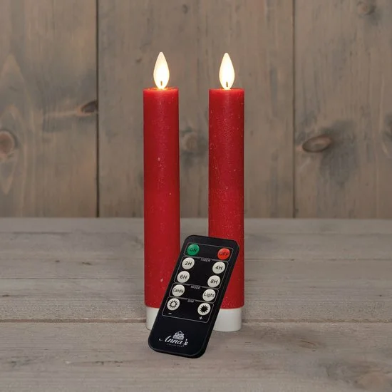LED dinerkaarsen 2x stuks van 18 cm. Voeg een vleugje luxe toe aan je diner met deze set van 2x stuks dinerkaarsen in de kleur rood. Met een hoogte van 18 cm en LED bewegende vlam, zorg je voor een warme en elegante sfeer. Gemakkelijk te bedienen met de meegeleverde afstandsbediening, inclusief dimmer en timer functie. 1 AA batterijen per kaars worden niet meegeleverd. Laat de betovering van kaarslicht zonder zorgen om open vuur je tafel verfraaien met deze stijlvolle LED dinerkaarsen.
