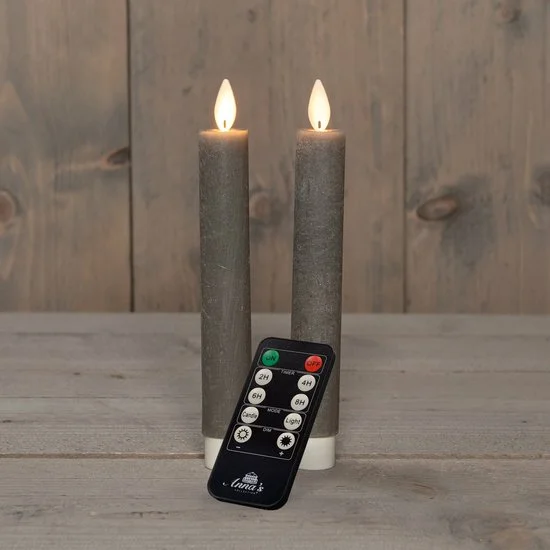 LED dinerkaarsen 2x stuks van 18 cm. Voeg een vleugje luxe toe aan je diner met deze set van 2x stuks dinerkaarsen in de kleur taupe. Met een hoogte van 18 cm en LED bewegende vlam, zorg je voor een warme en elegante sfeer. Gemakkelijk te bedienen met de meegeleverde afstandsbediening, inclusief dimmer en timer functie. 1 AA batterijen per kaars worden niet meegeleverd. Laat de betovering van kaarslicht zonder zorgen om open vuur je tafel verfraaien met deze stijlvolle LED dinerkaarsen.