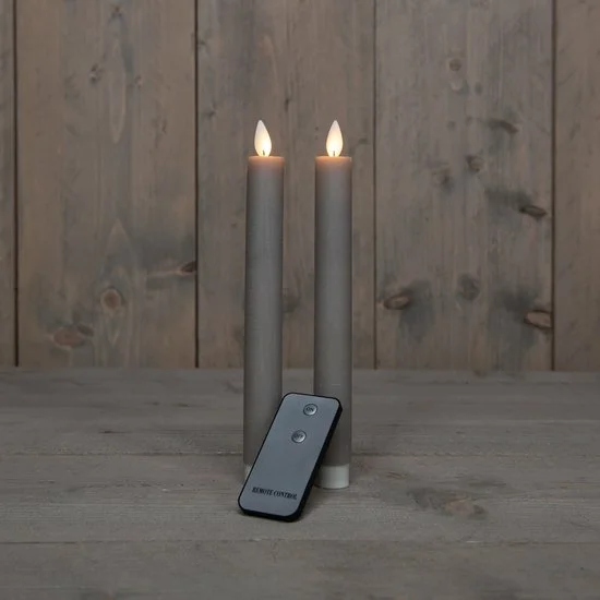 LED dinerkaarsen 2x stuks van 23 cm. Voeg een vleugje luxe toe aan je diner met deze set van 2x stuks dinerkaarsen in de kleur taupe. Met een hoogte van 23 cm en LED bewegende vlam, zorg je voor een warme en elegante sfeer. Gemakkelijk te bedienen met de meegeleverde afstandsbediening, inclusief dimmer en timer functie. 2 AA batterijen per kaars worden niet meegeleverd. Laat de betovering van kaarslicht zonder zorgen om open vuur je tafel verfraaien met deze stijlvolle LED dinerkaarsen.