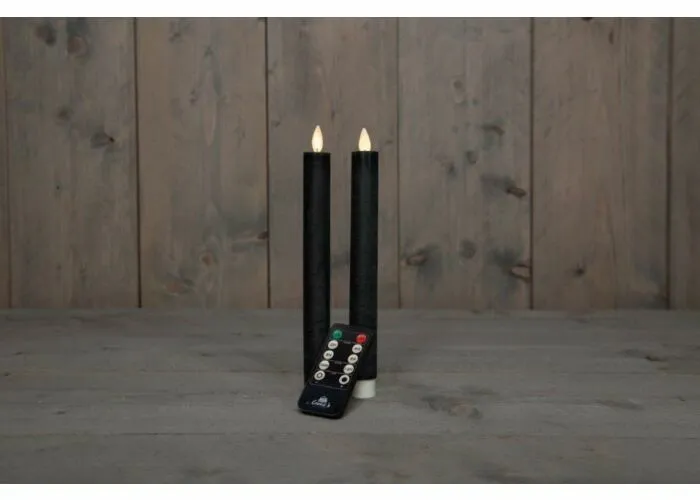 LED dinerkaarsen 2x stuks van 23 cm. Voeg een vleugje luxe toe aan je diner met deze set van 2x stuks dinerkaarsen in de kleur zwart. Met een hoogte van 23 cm en LED bewegende vlam, zorg je voor een warme en elegante sfeer. Gemakkelijk te bedienen met de meegeleverde afstandsbediening, inclusief dimmer en timer functie. 2 AA batterijen per kaars worden niet meegeleverd. Laat de betovering van kaarslicht zonder zorgen om open vuur je tafel verfraaien met deze stijlvolle LED dinerkaarsen.
