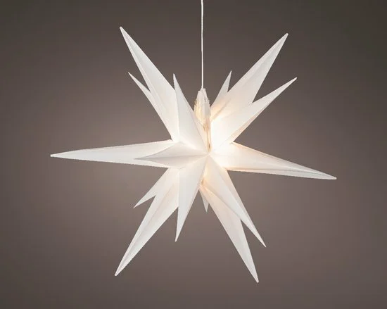 Deze witte PVC ster inclusief lichtbron sluit u aan op het lichtnet dmv een transformator.