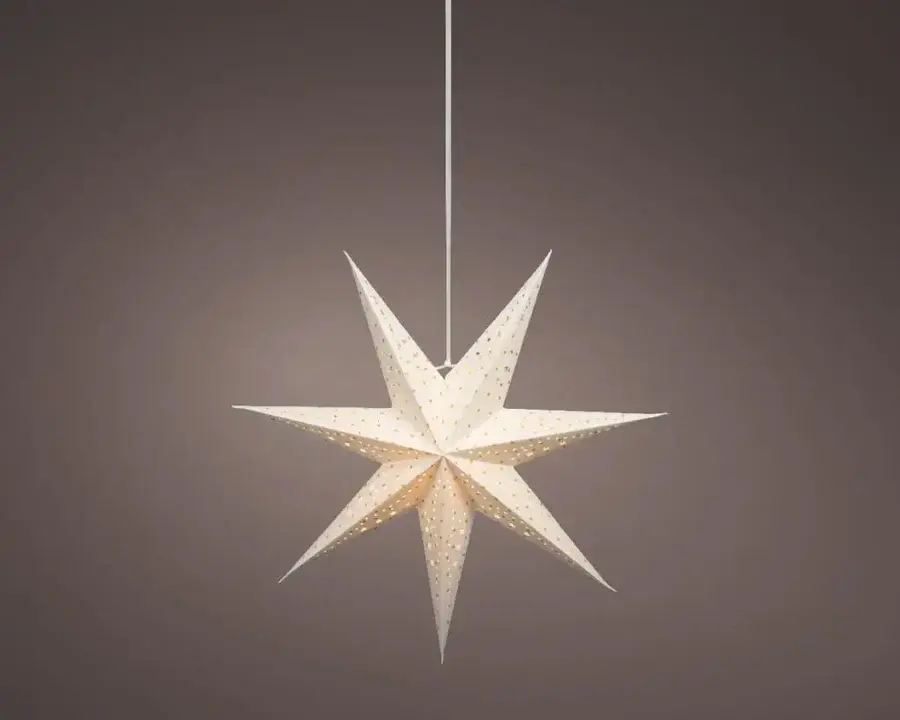 Deze witte papieren ster inclusief lichtbron sluit u aan op het lichtnet dmv een transformator.