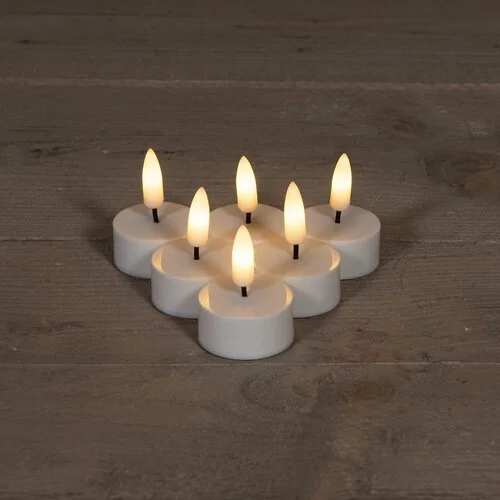 Creëer een gezellige sfeer met deze set van 6 witte LED-theelichtjes met 3D-vlam. Perfect voor het decoreren van kerststukken, kerstkransen of als tafeldecoratie. Deze LED-theelichtjes bieden een veilig alternatief voor echte kaarsen, ideaal voor huishoudens met kinderen of huisdieren. Ze werken op batterijen (niet inbegrepen) en zijn eenvoudig te plaatsen waar je maar wilt.