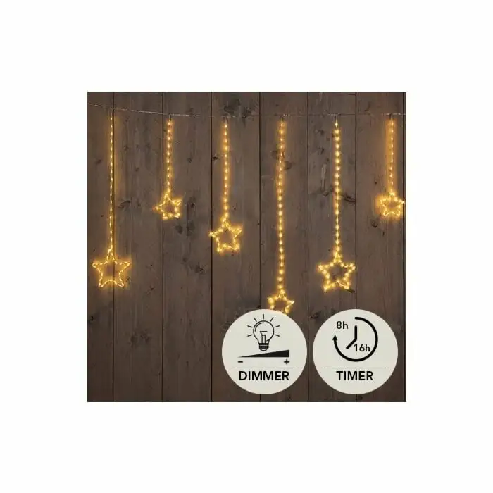 Laat je huis of tuin stralen met dit gordijn met schitterende sterren! Het gordijn heeft een lengte van 200 cm en beschikt voer 10 strengen met sterren met een maximale lengte van 80 cm. Het totale gordijn bestaat uit 364 LED lichtjes in de kleur classic warm. Word gevoed door een adapter en de aansluit kabel is transparant en heeft een lengte van 5 meter. De verlichting is te dimmen en heeft een timerfunctie van 8 aan en16 uur uit. Het snoer is geschikt voor binnen en beschut buiten gebruik (IP44)